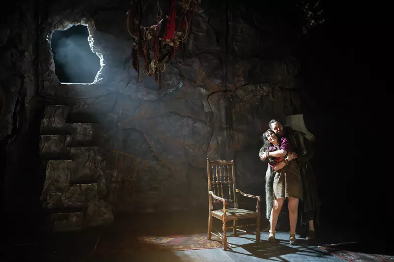 Our stage is kitted out, just like we would expect from early man – a cave with red painting on the wall of it, depicting hunting of animals by humans, with a small staircase of rock and hole at the top shining in light. The set changes little but when we move from the outside, in, to show the development of the family to the “others” (or, Sh*theads as they are known), this becomes a little more sophisticated; a standing lamp, chandelier made from bones, carpets put out – along with the animal print clothing that borders on modern, there’s a unique modernist yet dystopian feeling to this view of the past.